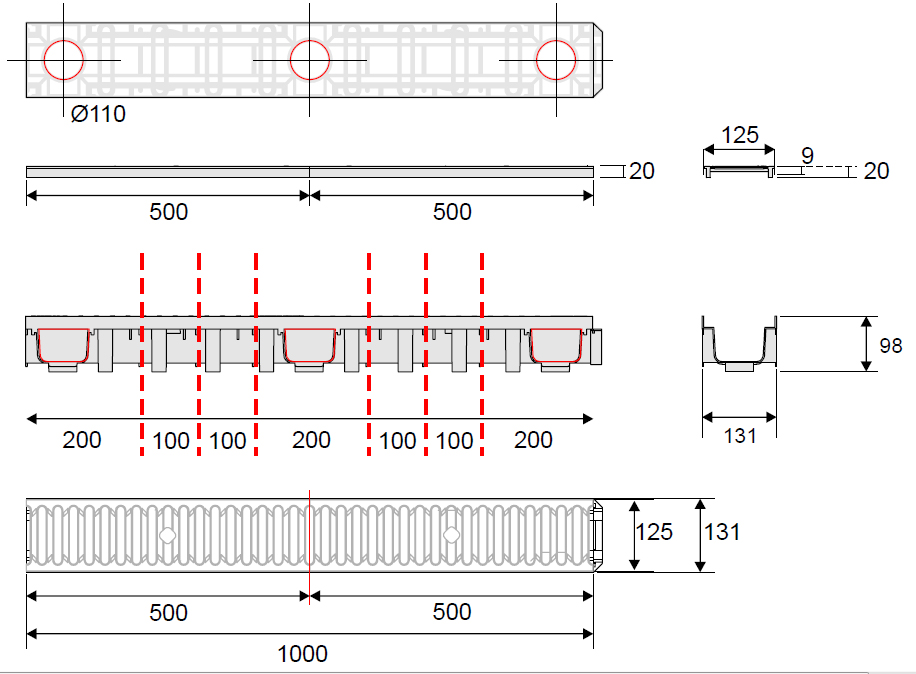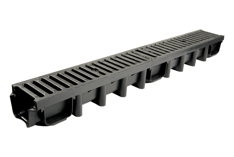 Kanał odwodnieniowy z kratą żeliwną B125 – Wysokość 98 mm | kanał z PP + krata z żeliwa