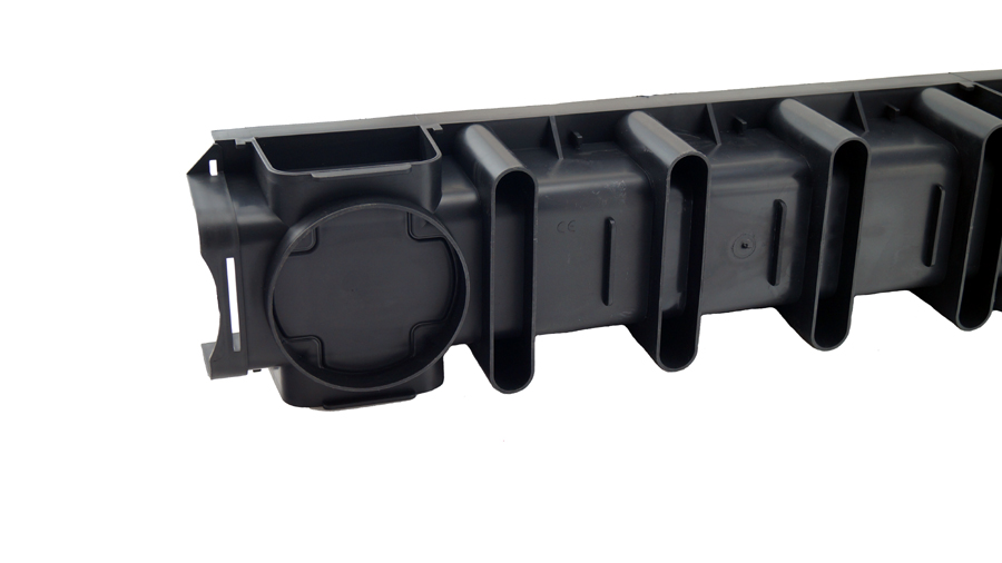 Do kanału można podłączyć rurę Ø 110 nasuwając ją na odpływ. Możliwe jest również wycięcie w dnie kanału odpływu na rurę Ø 110.