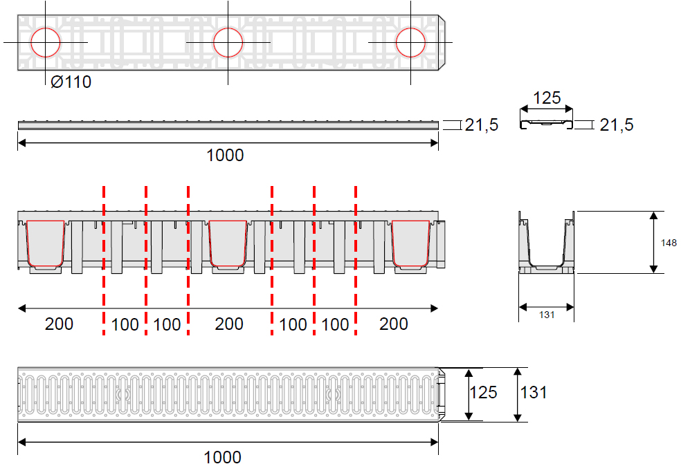 Wymiary : 1000 x 131 x 148 [mm] (długość x szerokość x wysokość)