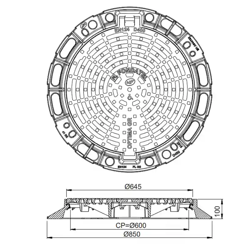 Rama została wzmocniona żebrowaniem z podstawą do zabetonowania. Wokół ramy znajdują się 4 otwory umożliwiające zakotwiczenie w betonie oraz 2 uchwyty do podnoszenia ułatwiające użytkowanie. Amortyzację zapewnia wymienialna polietylenowa uszczelka przymocowana do ramy. Zawias na którym jest osadzona krata otwiera się pod kątem > 110° co gwarantuje łatwą i bezpieczną obsługę. Kratę można zdjąć z zawiasu pod kątem 90°.